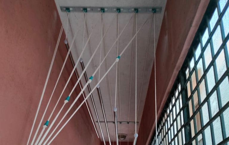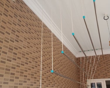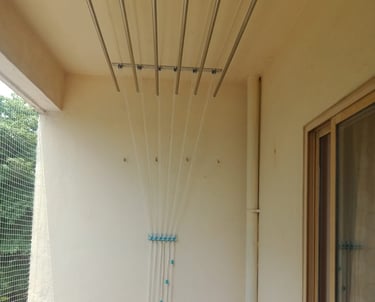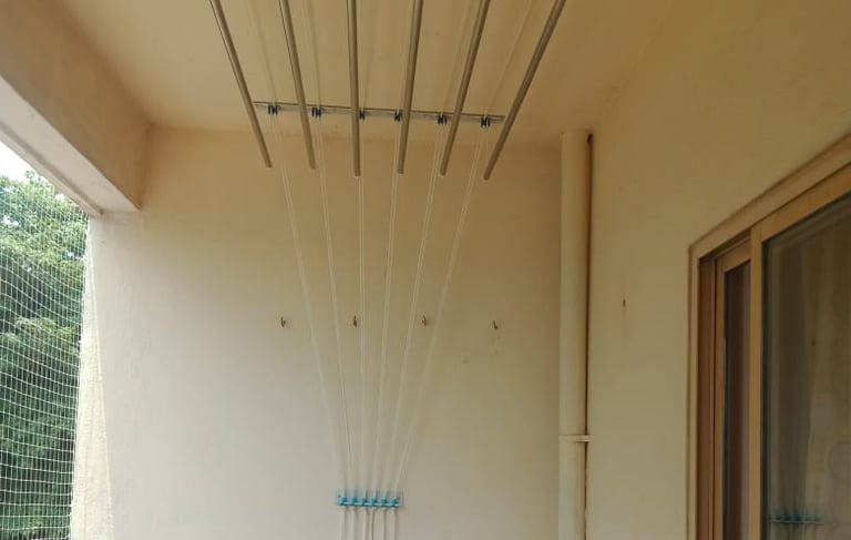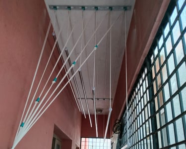 Roof Mounted Balcony cloth drying hangers offer a practical and efficient way to dry clothes indoors, making them a popular choice for apartments, small homes, or during inclement weather. When used correctly, they can extend the lifespan of your clothes and provide a reliable indoor drying solution. A balcony cloth hanger is a practical and space-saving solution to dry wet clothes in your home. With the convenience of stainless steel (SS) rods and ropes, you can efficiently air-dry your laundry, making the most use of your balcony space for other purposes.