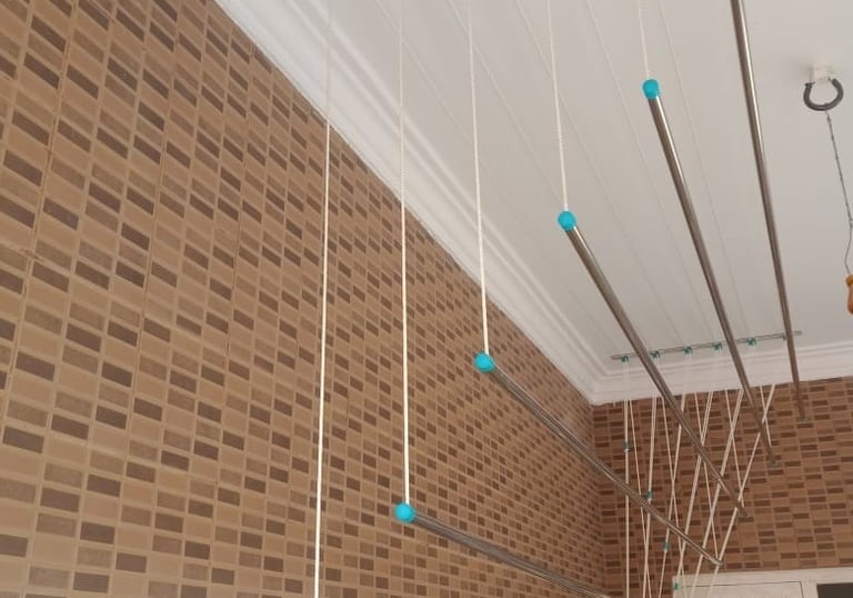 Pulley cloth drying hangers are usually mounted on the ceiling using screws to fit the Iron Clamps. It's essential to ensure that the installation is sturdy and capable of holding the weight of wet clothes. The SS Rods have a pulley system that allows you to lower and raise the Rope of the hanger for easy drying of clothes at different levels. The number of clothes you can hang on the Cloth line hanger depends on its size and design providing ample space for drying numerous garments simultaneously. Ceiling cloth drying hangers are excellent space savers as they utilize the vertical space in a room or balcony, freeing up floor space for other purposes. When using indoor cloth hangers to dry wet clothes, ensure that the room is well-ventilated to allow moisture from the drying clothes to escape. This helps prevent mold and mildew growth.