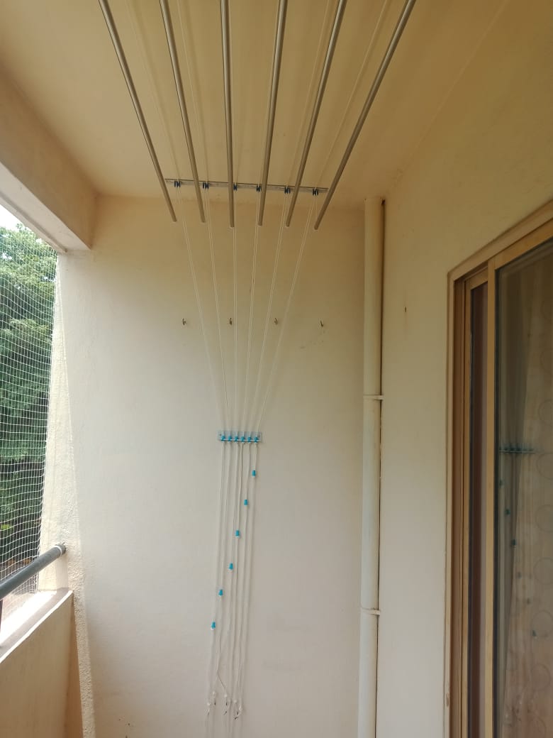 Cloth drying hangers with Pulley are usually mounted on the ceiling using screws to fit the Iron Clamps. It's essential to ensure that the installation is sturdy and capable of holding the weight of wet clothes. The SS Rods have a pulley system that allows you to lower and raise the Rope of the hanger for easy drying of clothes at different levels. The number of clothes you can hang on the Cloth line hanger depends on its size and design providing ample space for drying numerous garments simultaneously. Ceiling cloth drying hangers are excellent space savers as they utilize the vertical space in a room or balcony, freeing up floor space for other purposes. When using indoor cloth hangers to dry wet clothes, ensure that the room is well-ventilated to allow moisture from the drying clothes to escape. This helps prevent mold and mildew growth.